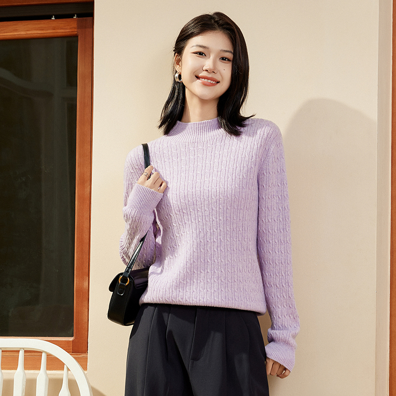 【100%绵羊毛】恒源祥羊毛衫女时尚半高领打底纯色绞花纹理针织衫 175/96A/XL 花米紫