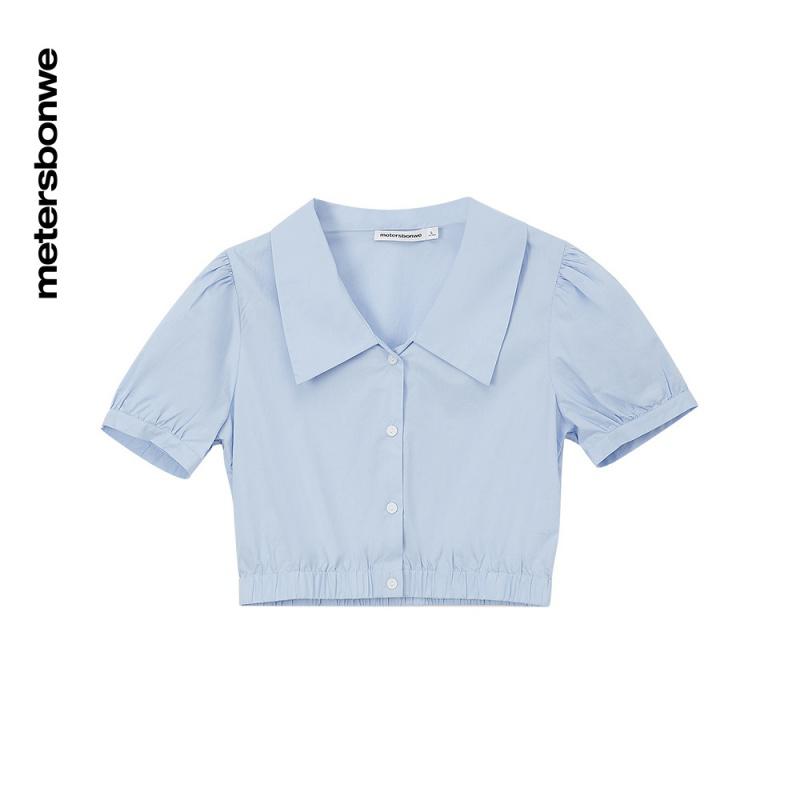 美特斯邦威泡泡袖衬衫女百搭夏季高腰松紧V领短袖上衣女_912 155/S(高155-160重90-105斤) 羊绒蓝