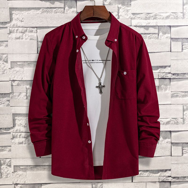 2021春秋款纯色磨毛有口袋青中老年长袖韩版修身灯芯绒宽松衬衫男 L 酒红色