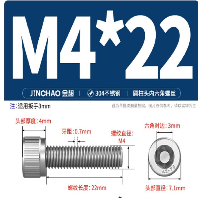 金超 304不锈钢内六角螺丝钉 M4x22 50个/包 1包