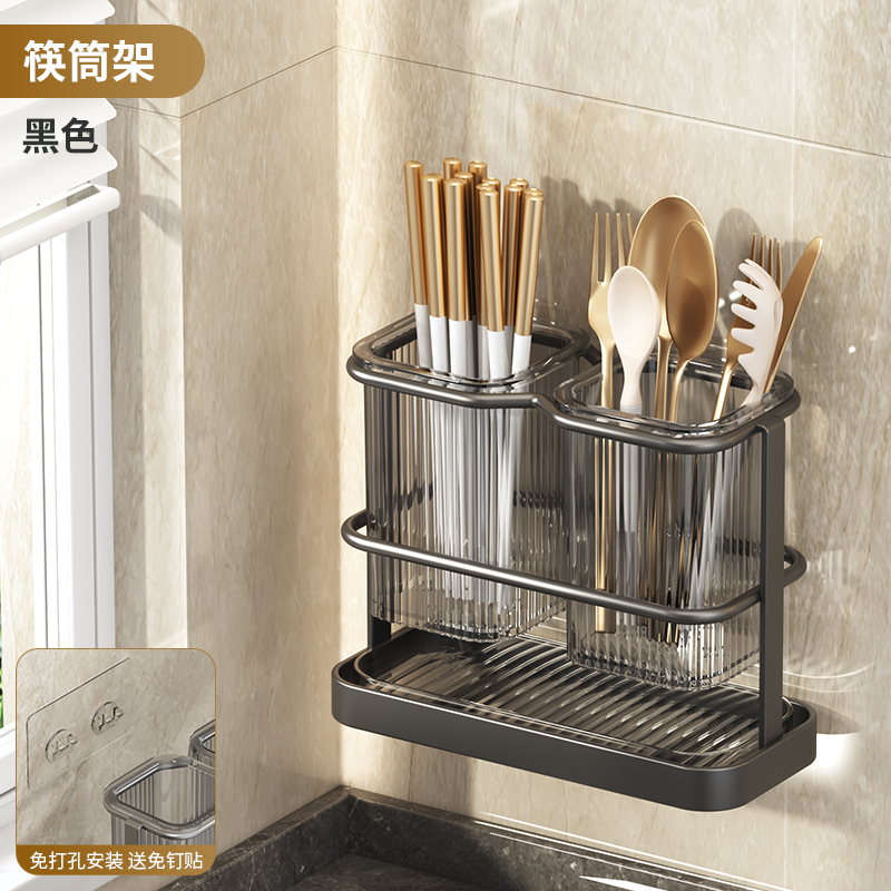 厨房刀架筷子笼置物架壁挂多功能菜板刀具一体收纳架筷笼菜刀挂式 黑色双筒【可台面/壁挂】