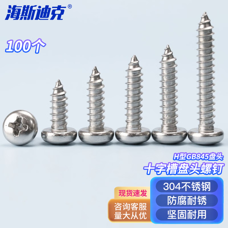 自营 海斯迪克 HK-100 304不锈钢十字槽盘头自攻螺钉H型 GB845盘头ST6.3×13 100个