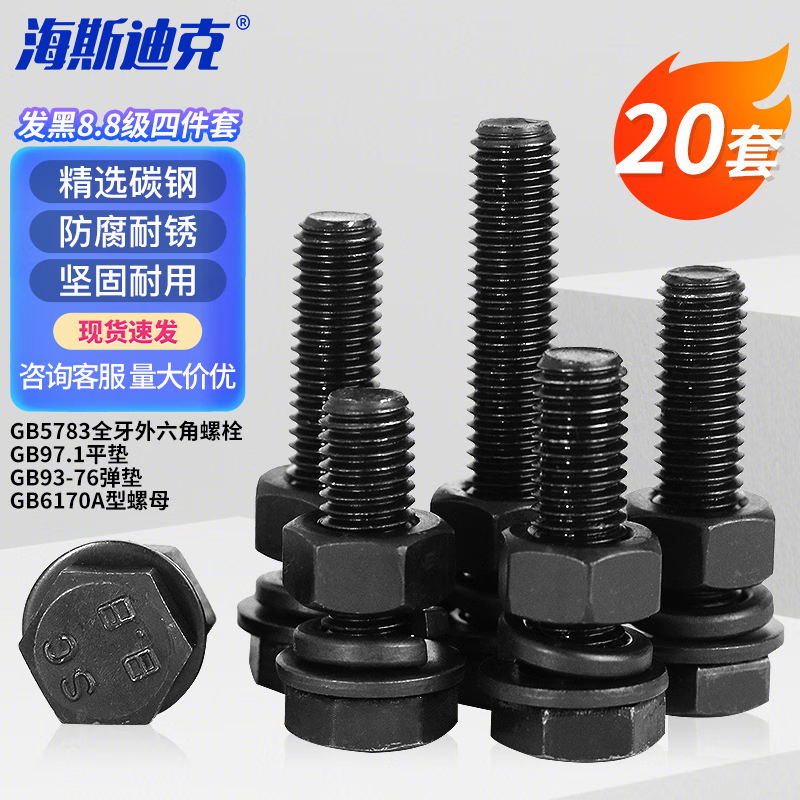 自营 海斯迪克 HKSY-9 发黑8.8级外六角螺栓螺母平垫弹垫四件套组合 M6*10(150套)