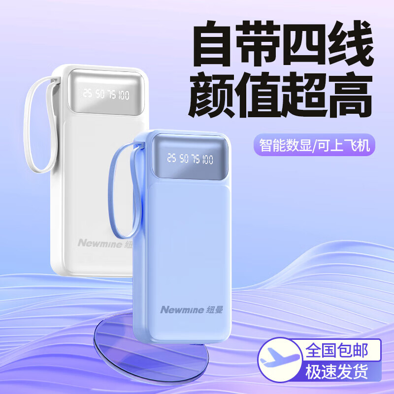 纽曼自带线充电宝20000毫安时PC20便携双向充电移动电源 蓝色