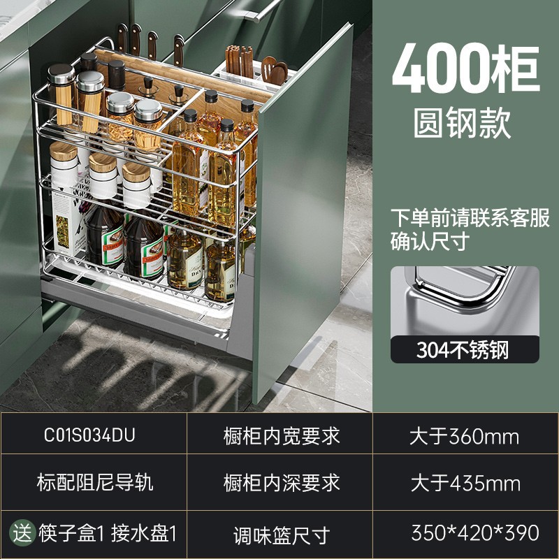 尔沫厨房橱柜调味拉篮不锈钢双层调料拉篮抽屉式调味品拉篮滑轨厨房收纳篮调料架调味篮 实心304不锈钢圆钢-400柜体