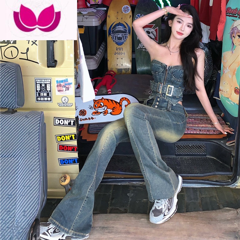 七斓炸街辣妹套装女夏季新款设计感短款牛仔上衣高腰喇叭牛仔新套 M 裤子