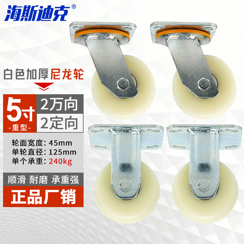 海斯迪克 白色加厚尼龙轮 工业脚轮 推车轮子套装 5寸重型2定2万