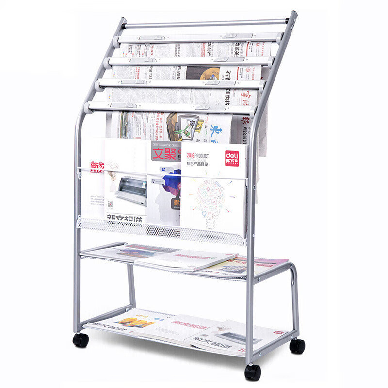 得力(deli) 9303报刊架海量型灰色 7层铝合金夹条 高1.08米 万向轮