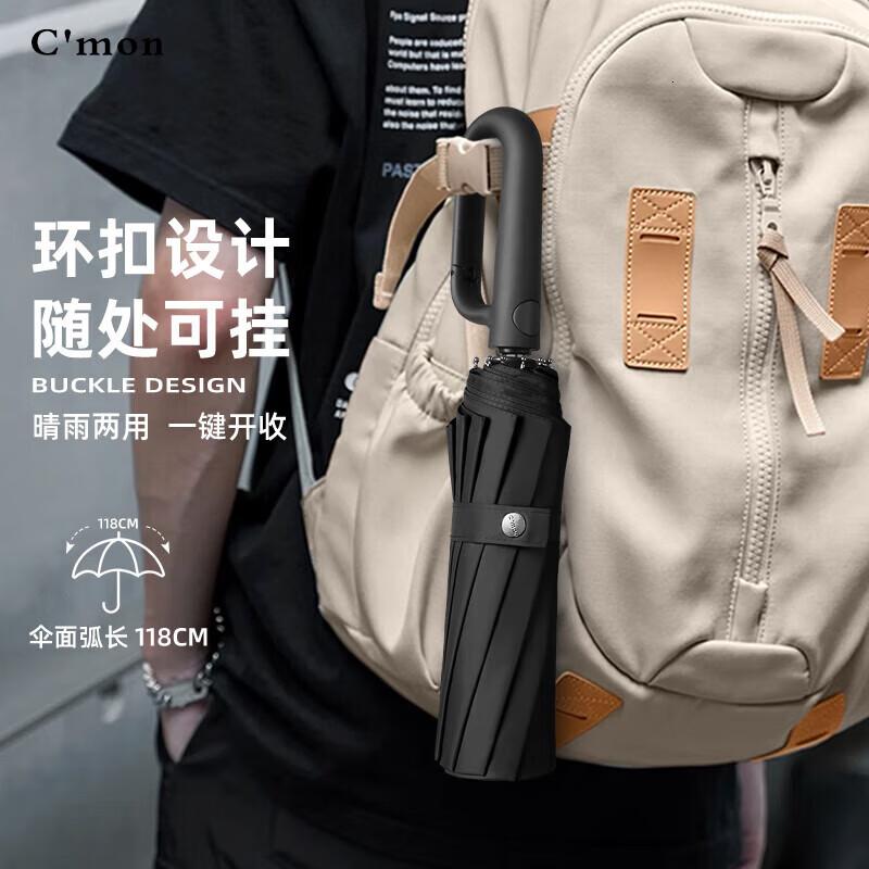 C'mon全自动晴雨伞三折大号防晒太阳伞遮阳伞男士环扣自动伞黑色_587