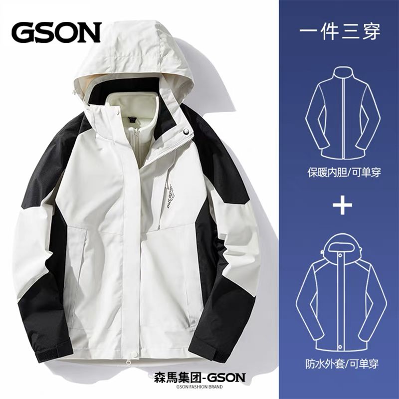 冲锋衣男女情侣三合一可拆卸登山服春秋冬季加绒外套_290 5XL 男款/象牙白【含内胆】
