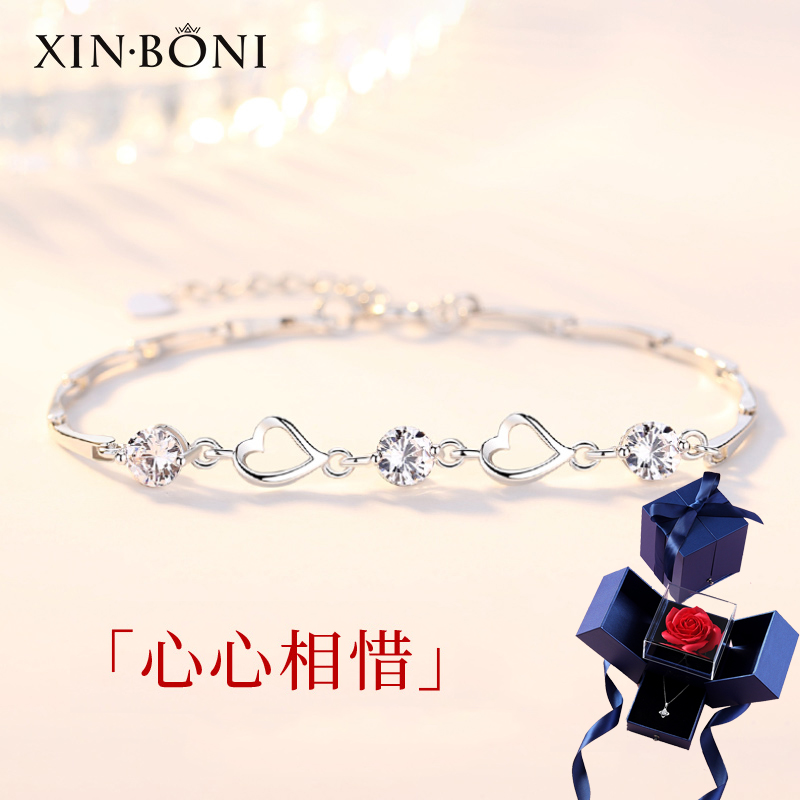 鑫铂尼 925银手链女韩版简约ins小众设计时尚珠宝首饰饰品爱心闺蜜女生女士七夕情人节送女友生日礼物 心心相惜手链+英格兰礼盒+免费刻字