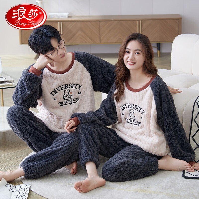 自营 浪莎睡衣情侣男女士法兰绒秋冬季珊瑚绒加绒加厚两件套大码可外穿套装 简约撞色 男XXXL【175-200斤】