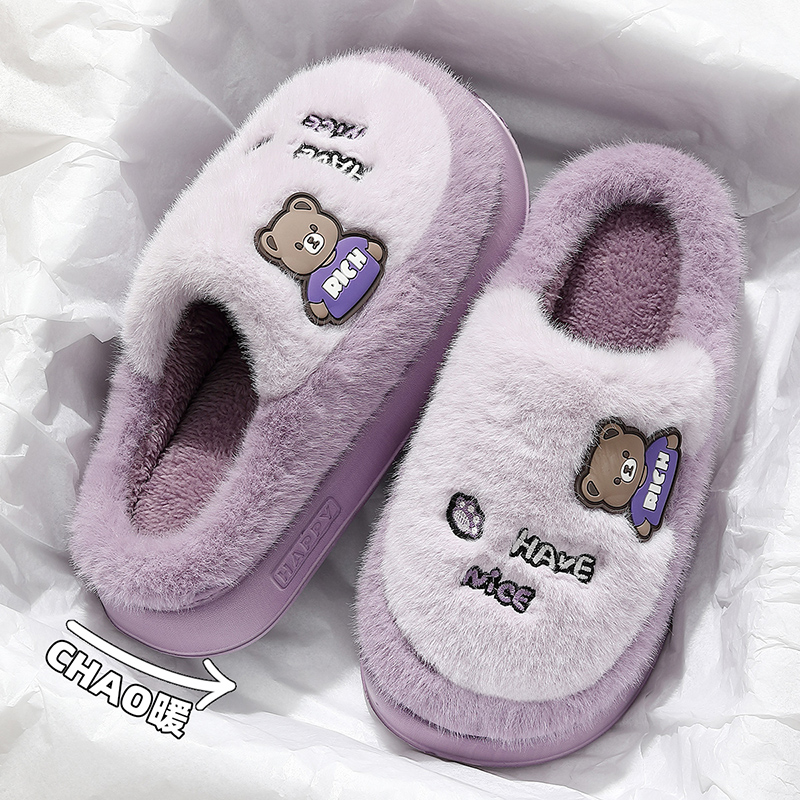 棉拖鞋男款秋冬季2025新款室内家居防滑厚底毛毛绒保暖男士拖鞋女 紫色【可爱小熊】 36/37【适合35-36(内长22.5