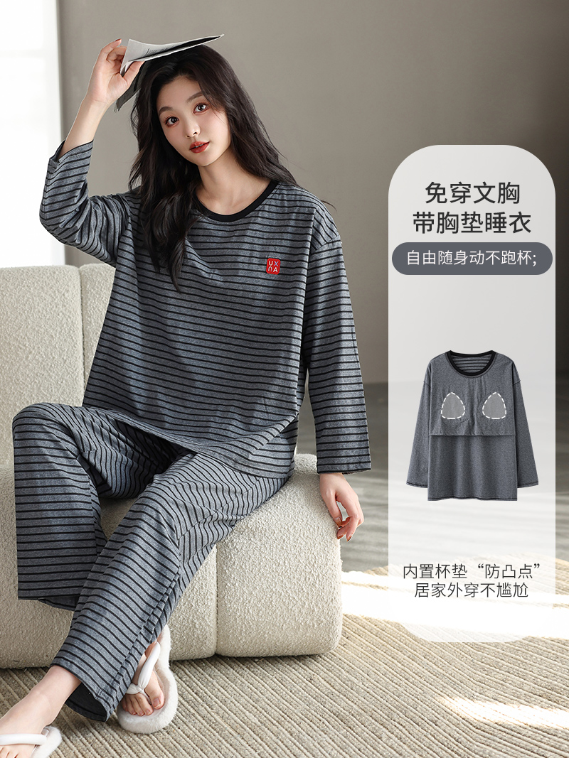 浪莎睡衣女士春秋款纯棉长袖带胸垫简约时尚条纹大码可外穿家长简 XXL码 66253