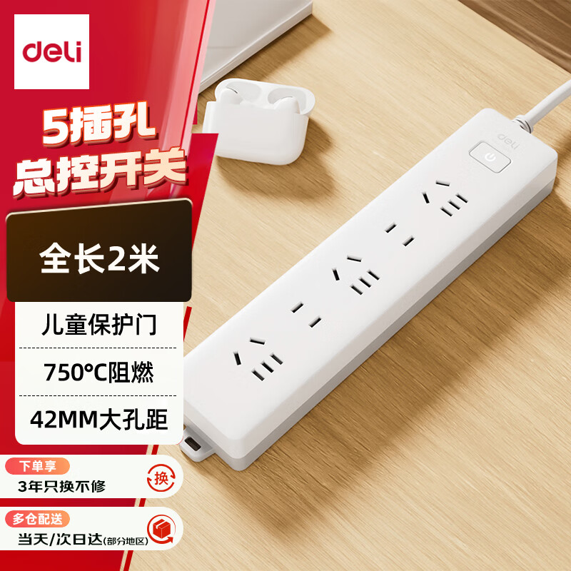 得力(deli)3C认证国标安全插座 插排/插线板/接线板/排插/拖线板 总控开关 儿童保护门 5位2米 18252
