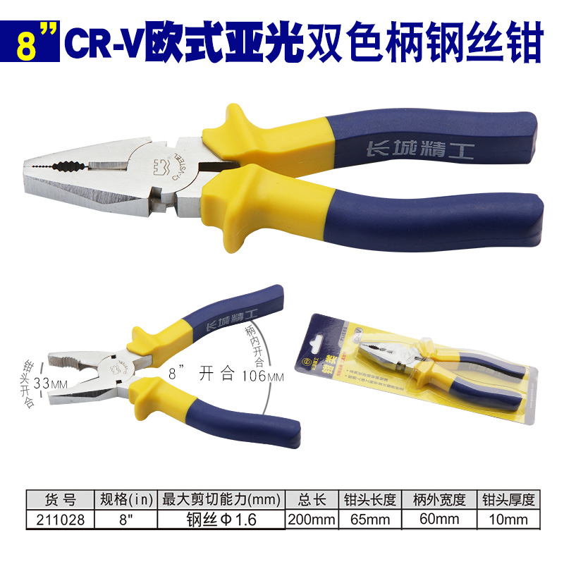 长城钢丝钳老虎钳电工钳子多功能手钳工业级虎口钳200mm7/8寸 8寸CRV欧式亚光钢丝钳211028