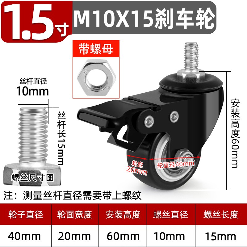 脚轮手推车丝杆滑轮聚氨酯滚轮轱辘 1.5寸M10*15刹车轮(带螺母 )20只