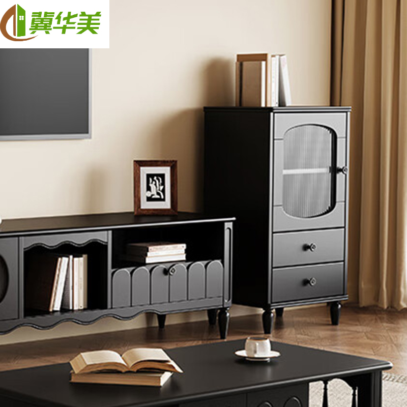 自营 冀华美0729-实木茶几电视柜组合家用客厅储物边柜中古风收纳置物柜边柜复古黑490*400*950mm