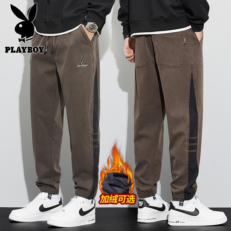花花公子新款高品质(实拍)秋冬款休闲裤男宽松潮牌工装裤束脚拼接运动裤子_58_157 3XL 咖啡色