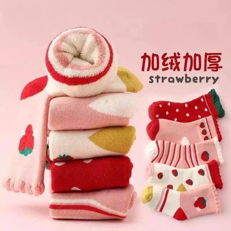 男童袜子冬季棉加厚加绒保暖毛圈袜女秋冬童袜儿童中筒棉袜 5双【鞋码19-24】1-3岁 加厚毛圈红色草莓