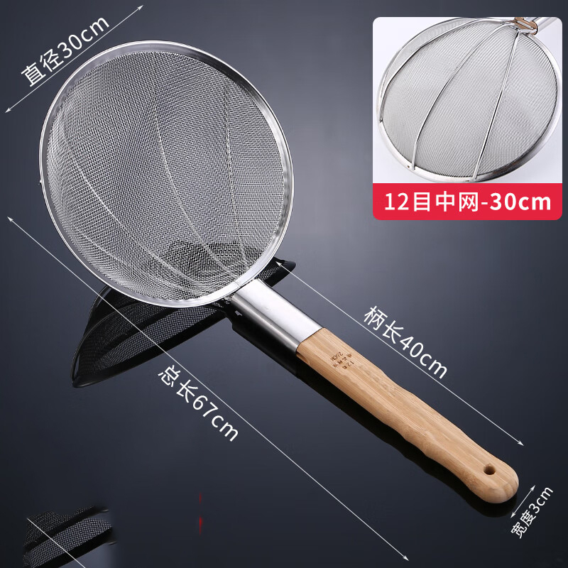 中锐智采 不锈钢漏勺 家用加大号捞勺木柄竹柄加固笊篱过滤网加密细商用酒店 12目中网30cm(商用)