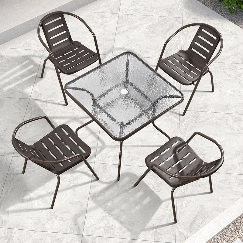 户外阳台桌椅 休闲庭院座椅室外花园餐桌椅 简约现代 铁艺家具 4【椅】+1【80X80水纹玻璃有孔方桌】