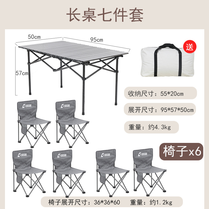 以素折叠桌椅套装户外露营野餐桌铝合金蛋卷桌便携式折叠桌野营折叠椅 钛灰色长桌七件套【含收纳包】