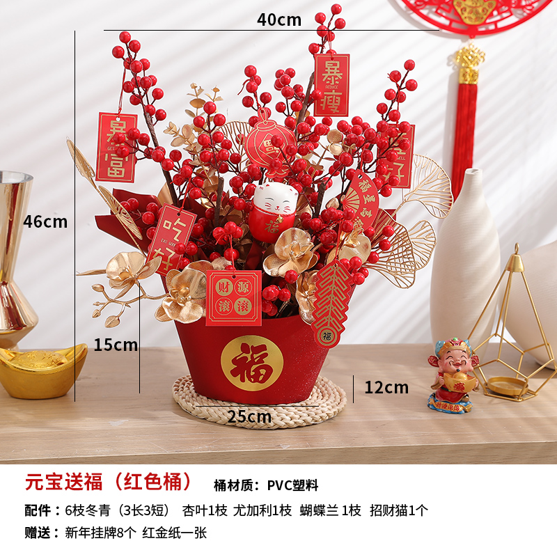 年宵花摆件抱抱桶新年福桶 元宝送福红色桶