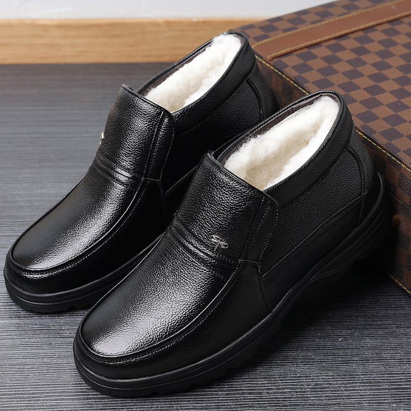 冬季男士棉鞋男鞋中老年人真皮防滑加绒加厚羊毛老人爸爸保暖皮鞋 黑色 39
