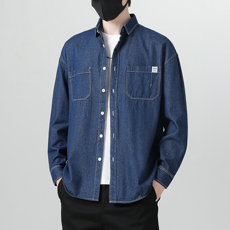 男装日系复古春秋季水洗牛仔衬衫纯色宽松工装长袖休闲衬衣男外套 XL 189-CS-CY20深蓝