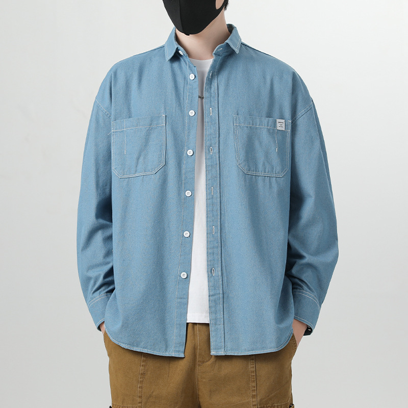 自营 男装日系复古春秋季水洗牛仔衬衫纯色宽松工装长袖休闲衬衣男外套 L 189-CS-CY20浅蓝