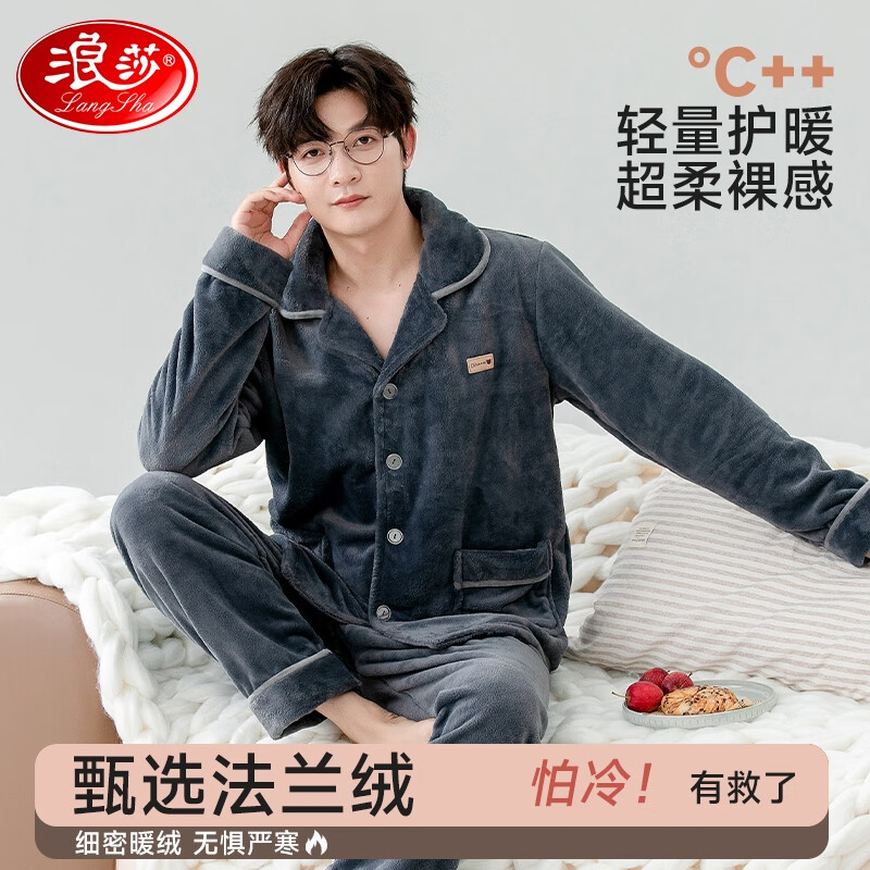 浪莎睡衣男士珊瑚绒秋冬季加绒加厚开衫翻领家居服可外穿简约两件套装 【加厚】家居休闲 XXL【145-175斤】