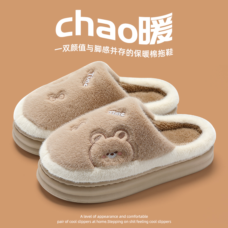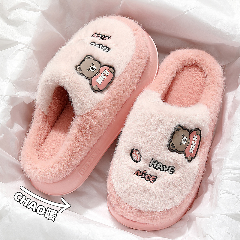 棉拖鞋男款秋冬季2025新款室内家居防滑厚底毛毛绒保暖男士拖鞋女 粉色【可爱小熊】 36/37【适合35-36(内长22.5