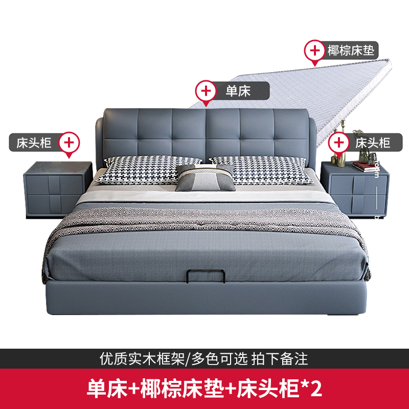 欧梵森 真皮床卧室双人床现代简约 主卧床实木床软靠床储物床1.8米床2m皮床北欧卧室家具 床+10cm椰棕床垫+床头柜*2 1.8米气压结构【多色可选,拍下请备注】