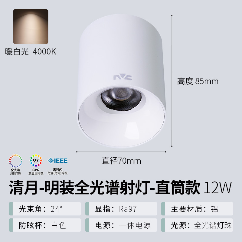 雷士照明明装折叠射灯 【直筒】12瓦暖白光丨全光谱RA97丨光束角24°丨防眩白杯