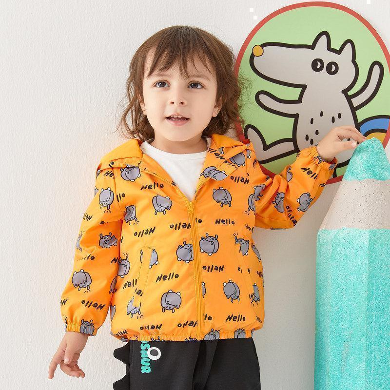 moomoo童装男女童外套春秋新款洋气小童宝宝趣味卡通满印印花外套_822 100/52 橘底卡通组
