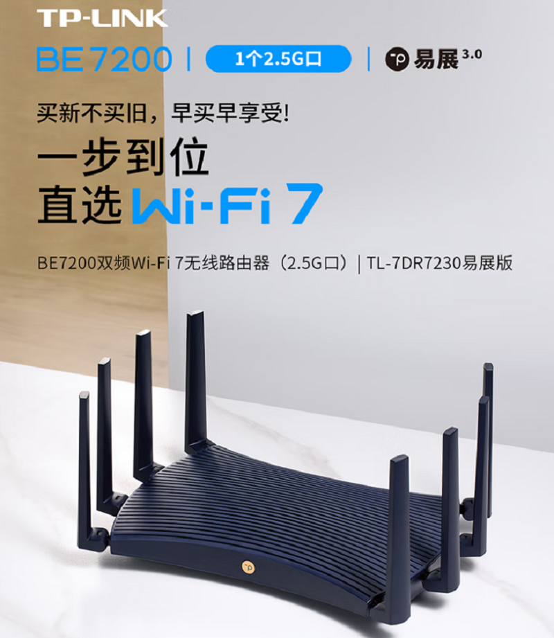 自营 TP-LINK BE7200WiFi7千兆双频无线路由器2.5G网口电竞路由9颗高效FEM游戏加速7DR7230