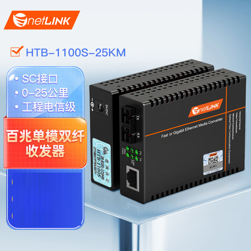 自营 netLINK 电信级光纤收发器 光电转换器 HTB-1100S-25KM 百兆单模双纤 外电 一对