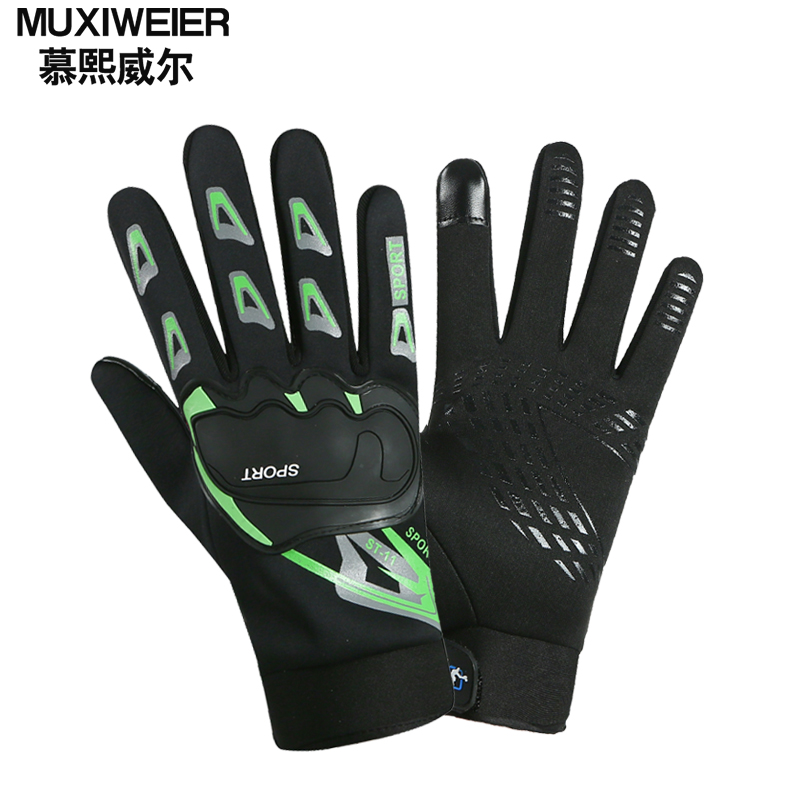 骑行手套男秋冬季保暖触屏防水防滑透气户外运动跑步开车山地摩托车防摔登山训练全指手套 黑绿色