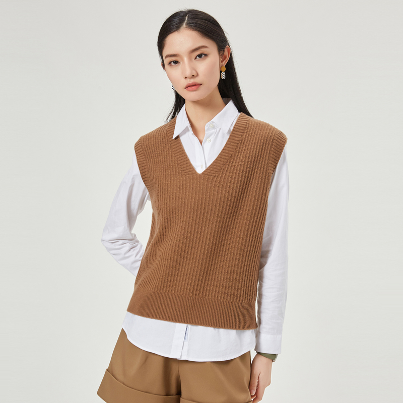 恒源祥纯羊毛针织背心女秋季新款复古竖坑条V领纯色无袖套头马甲 砺茶棕 165/88A/M