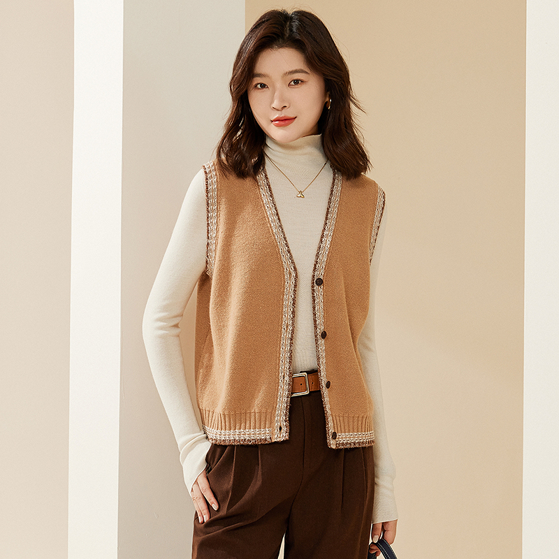 【100%绵羊毛】恒源祥无袖羊毛开衫女秋冬复古背心时尚民族风马甲 杏仁咖 175/96A/XL