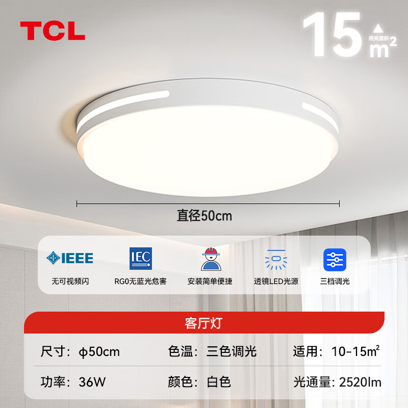 TCL照明 LED吸顶灯卧室灯现代中山灯具 知玉36W圆三色调光