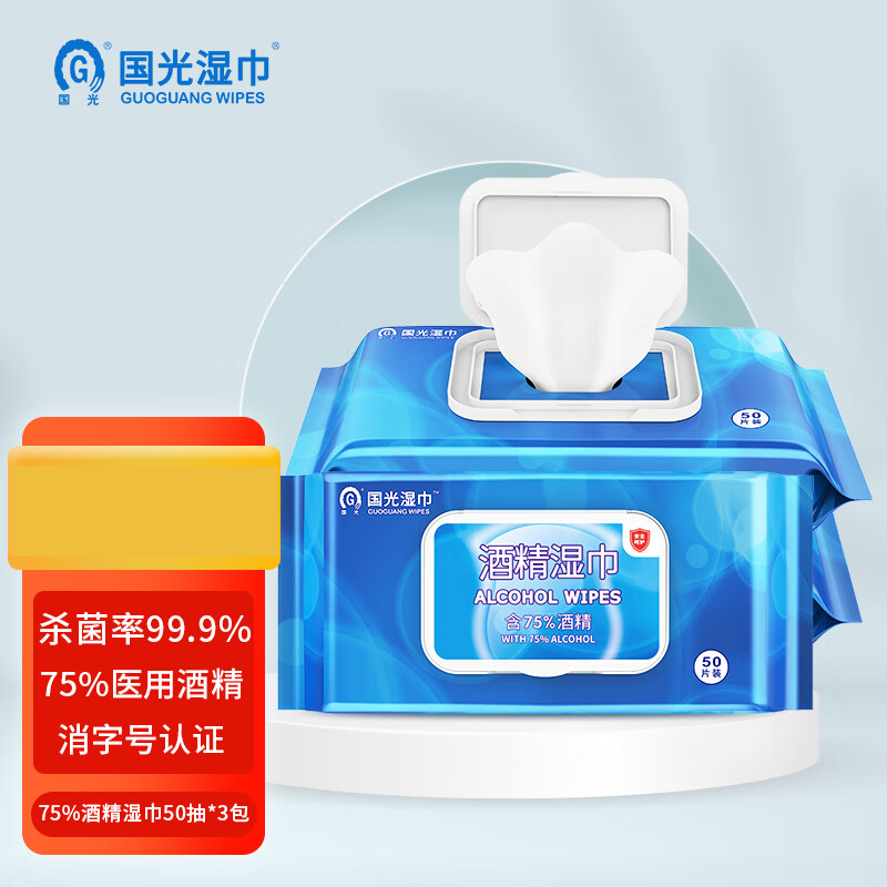 自营 国光 75%酒精湿巾 50抽*3包 杀菌率99.9%卫生消毒湿纸巾