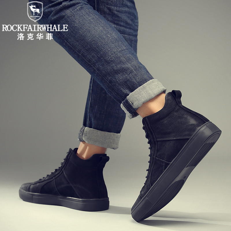 洛克华菲 2021冬季新款马丁靴男 真皮百搭休闲高帮鞋子英伦风男士短靴潮流男靴子新品加绒保暖中帮男鞋 黑色 40码