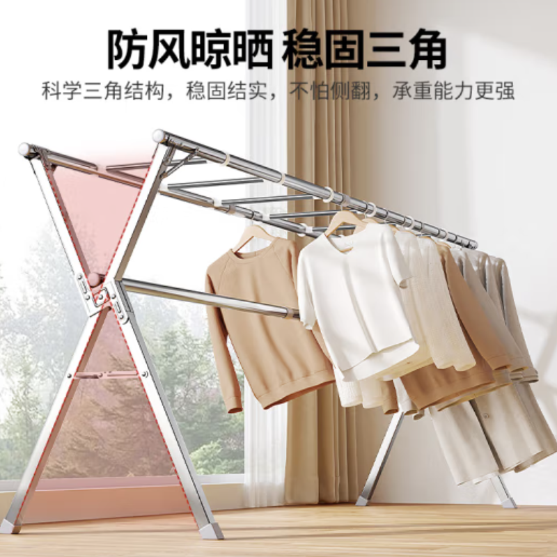 册宣 2.4米加横杆 晾衣架落地不锈钢折叠晾衣杆挂衣架 伸缩晒衣架