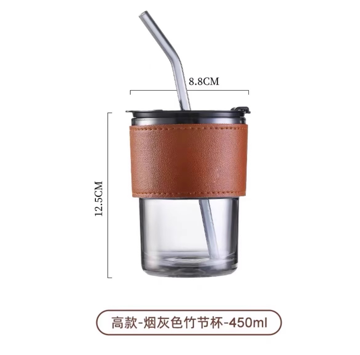 ins风玻璃杯带吸管带盖水杯女生高颜值咖啡杯冰美式竹节杯子 烟灰色【带盖+皮套+吸管】
