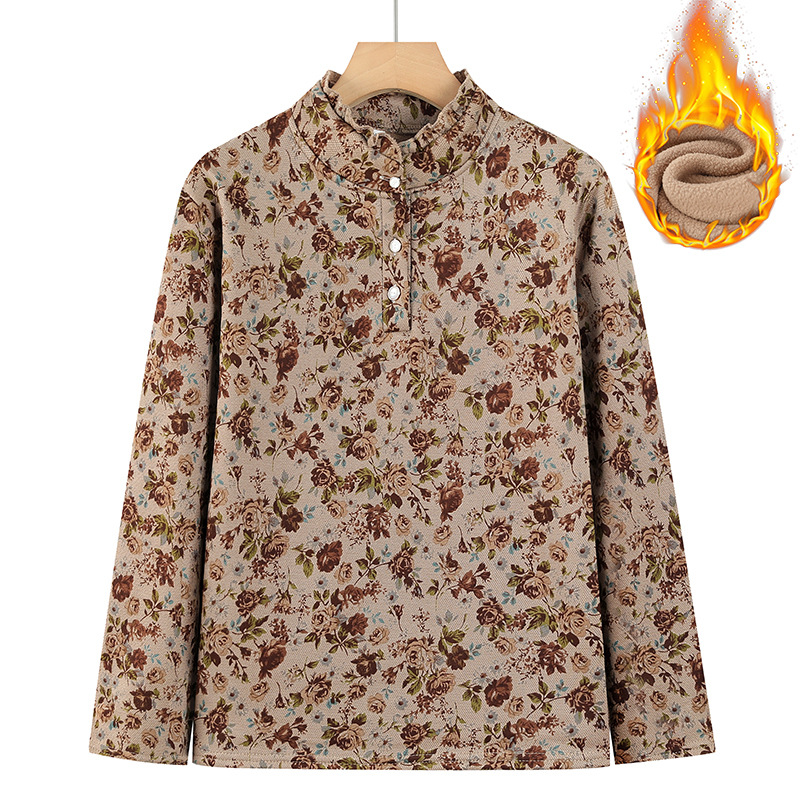 新款中老年女装冬季保暖妈妈装上衣加绒加厚内搭时尚印花冬季衣服 5XL(建议155-165斤) 咖碎花小衫