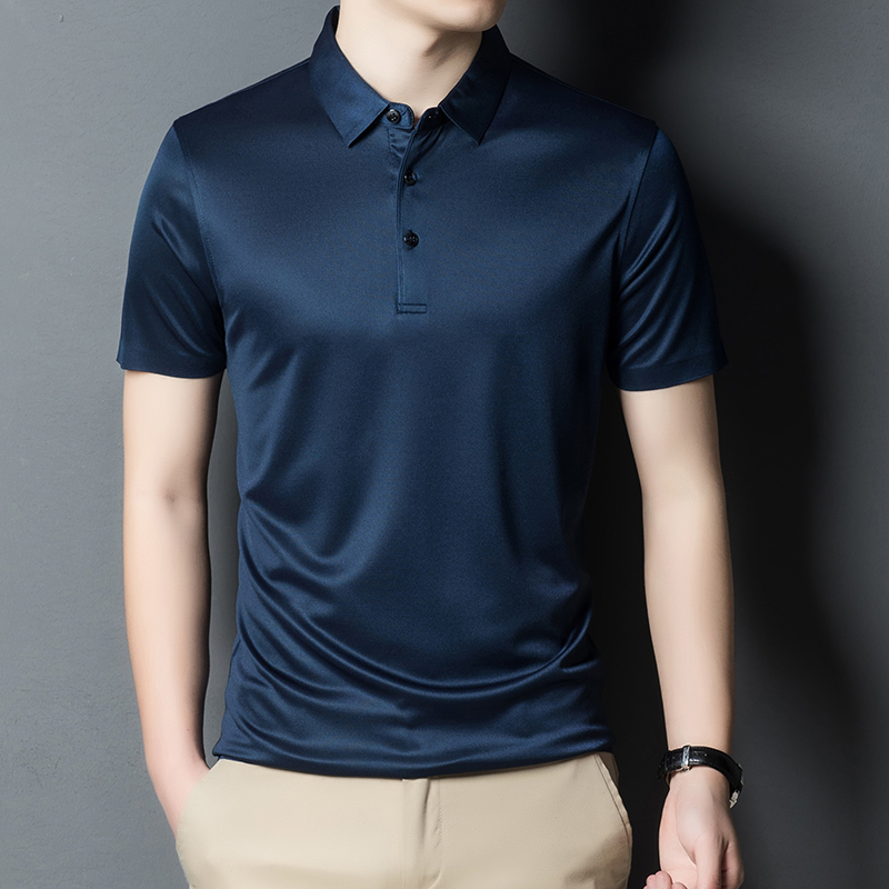 夏季男士桑蚕丝短袖t恤薄款翻领真丝条纹半袖大码POLO衫 170 深蓝色