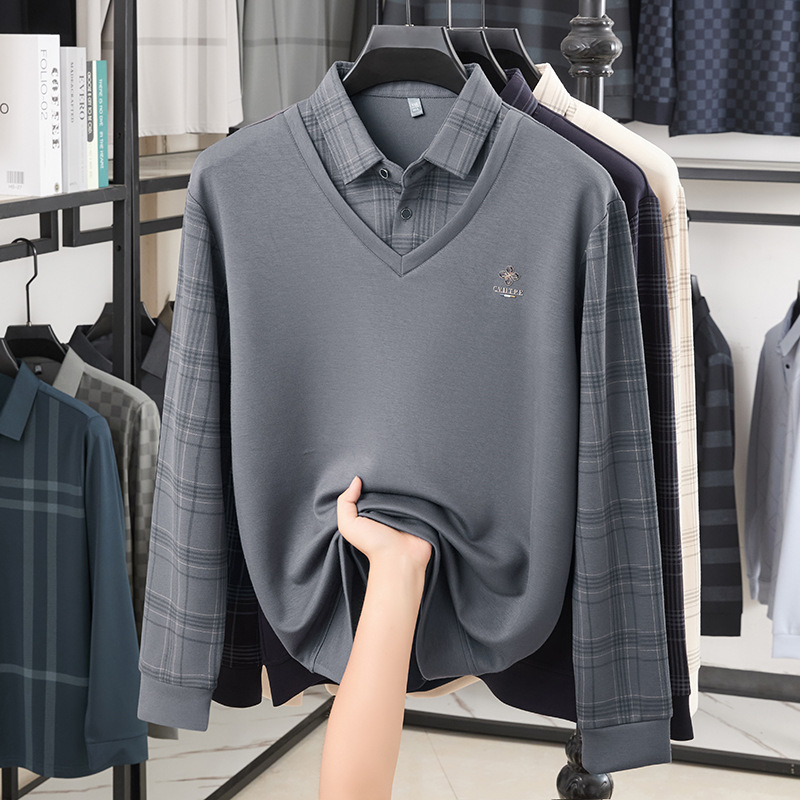 爸爸装春秋款长袖T恤中老年男士休闲套头打底衫秋季假两件polo衫 L 灰色