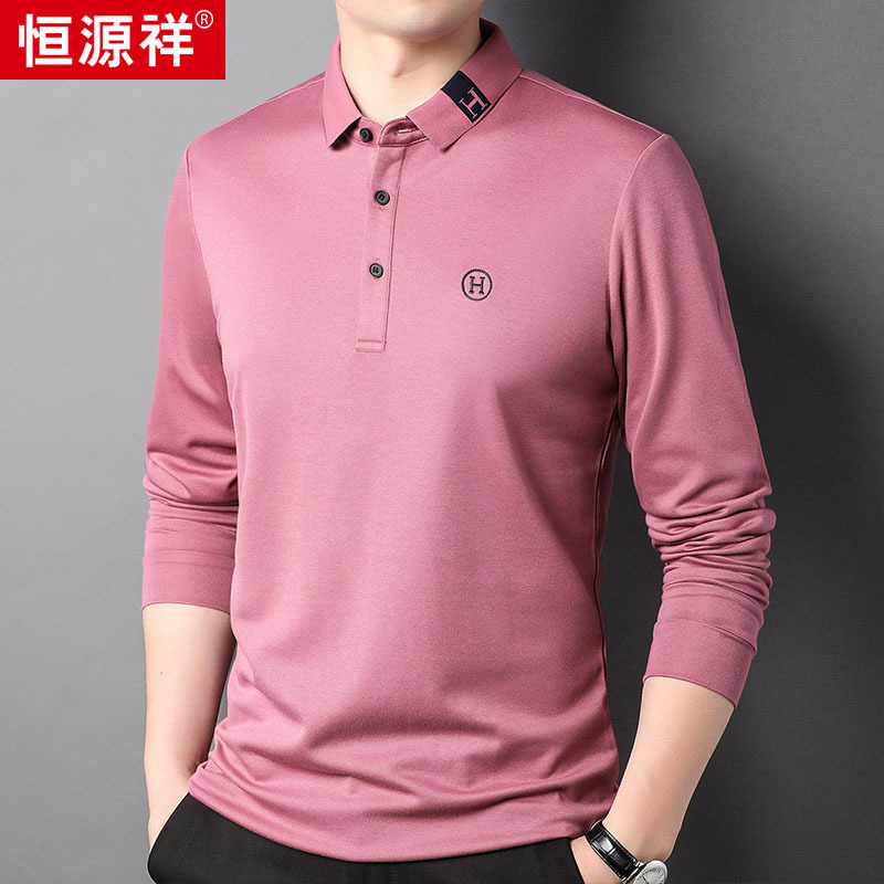恒源祥高端刺绣山羊绒长袖t恤男士2023秋冬新款莫代尔polo打底衫 3XL/190 粉红色